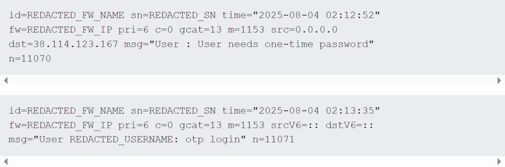 أفادت شركة Arctic Wolf بأن حملة الهجمات الأخيرة استهدفت جدران الحماية SonicWall، حيث تمكن المهاجمون من تجاوز التحقق المتعدد OTP بنجاح. وأوضح التقرير أن محاولات تسجيل الدخول واجهت عدة تحديات OTP متتالية، إلا أن المهاجمين تمكنوا من تخطيها، ما يشير إلى احتمال تسريب مفاتيح تشفير OTP أو تطوير وسيلة أخرى لتوليد الرموز.