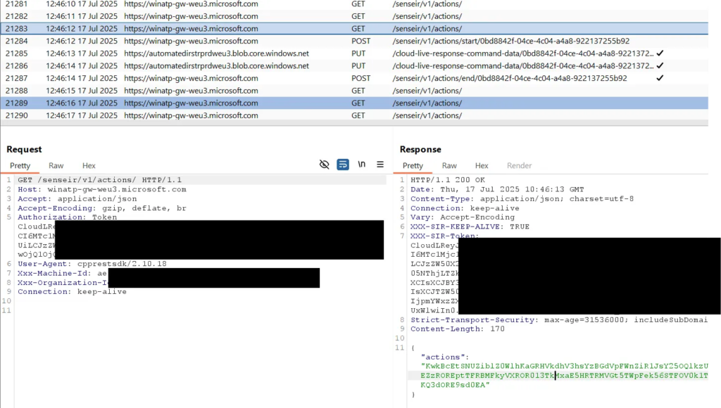 ثغرة موازية تؤثر على العناوين /senseir/v1/actions/ المستخدمة في Live Response والتحقيقات المؤتمتة، إذ يتم تجاهل رموز CloudLR أيضاً، ويمكن الحصول عليها دون تحقق بمجرد معرفة معرف الجهاز.