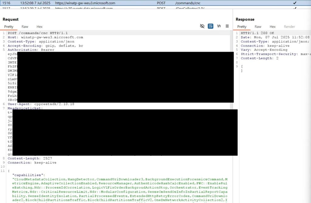 اعتمد البحث على تحليل سابق لهجمات تستهدف بيئة EDR، وركزعلى التفاعل بين عميل النظام والواجهات الخلفية السحابية. ومن خلال اعتراض حركة البيانات باستخدام أدوات مثل Burp Suite، وتجاوز آلية تثبيت الشهادات عبر تعديلات في الذاكرة باستخدام WinDbg، تمكن الباحثون من تتبع آلية تعامل العملية MsSense.exe مع الأوامر وعمليات الرفع.