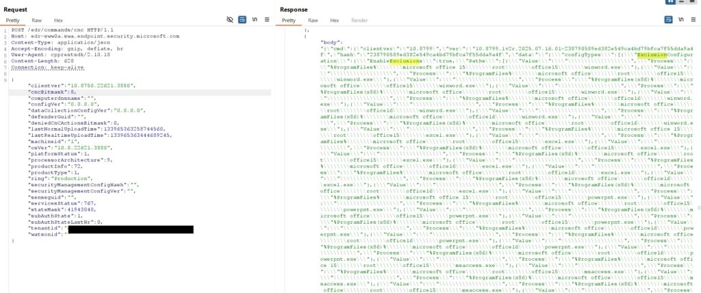 الأخطر أن الاستعلام عن /edr/commands/cnc دون بيانات تحقق يؤدي إلى تسريب ملف تهيئة بحجم 8 ميغابايت يحتوي على إعدادات حساسة مثل RegistryMonitoringConfiguration وDriverReadWriteAccessProcessList وقواعد ASR، وهي بيانات تكشف منطق الكشف الأمني ما يجعلها مفيدة لتفادي الاكتشاف.