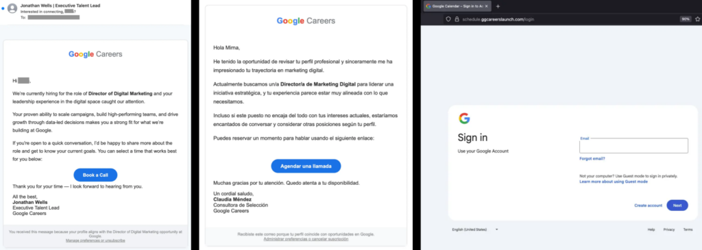 عندما ينقر المستخدم على رابط “Book a Call”، تبدأ سلسلة من الخطوات المصممة بدقة لإضفاء المصداقية على الهجوم. أولاً، تظهر صفحة تحقق مزيفة تحاكي واجهة Cloudflare Turnstile، تليها صفحة مقلدة لواجهة جدولة الاجتماعات الخاصة بـ Google Careers، والتي تطلب من المستخدم إدخال بيانات شخصية. وفي المرحلة الأخيرة، يوجه الضحية إلى صفحة تسجيل دخول وهمية تحاكي شاشة دخول جوجل الأصلية، حيث تجمع بيانات الاعتماد الحساسة.