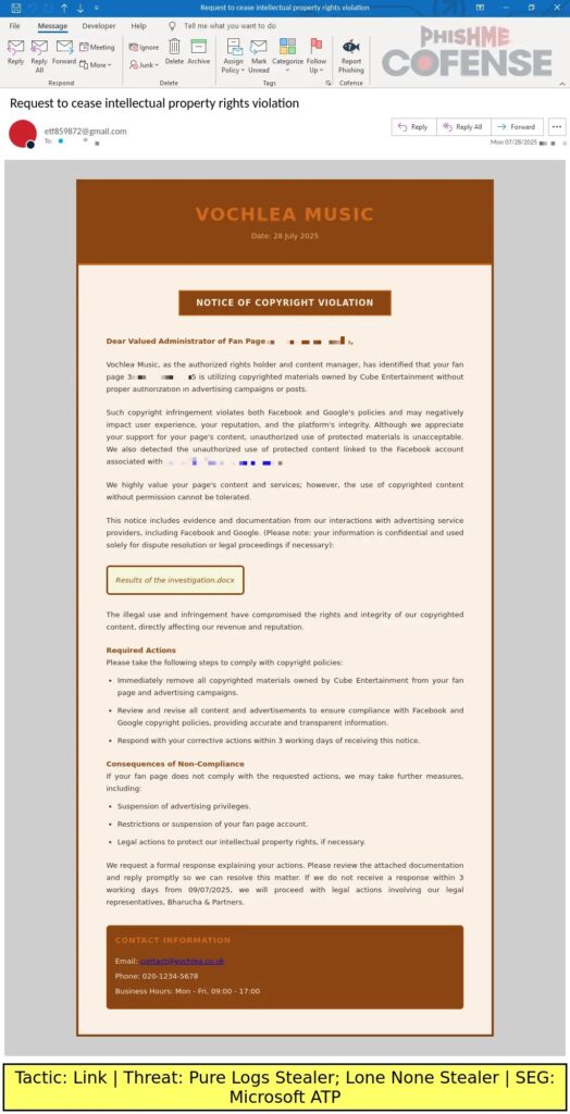 يرسل المهاجمون رسائل إلكترونية مزيفة تنتحل صفة مكاتب قانونية حول العالم وتدعي وجود انتهاكات لحقوق النشر على صفحات فيسبوك أو مواقع إلكترونية تابعة للضحايا. تشير هذه الرسائل إلى حسابات فيسبوك الحقيقية للمستهدفين لتعزيز المظهر الشرعي وزيادة فرص الخداع. المهاجمون أعدّوا قوالب بريدية بعدة لغات على الأقل من بينها الإنجليزية والفرنسية والألمانية والكورية والصينية والتايلندية، ما يشير إلى استخدام أدوات ترجمة آلية لتوسيع نطاق الحملة عالمياً.