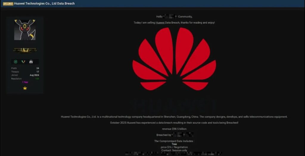 أعلن أحد المهاجمين السيبرانيين في مطلع أكتوبر 2025 مسؤوليته عن اختراق كبير استهدف شركة Huawei Technologies الصينية، زاعماً أنه استولى على الشيفرة المصدرية وأدوات التطوير الداخلية للشركة، ويعرضها الآن للبيع في منتدى على الشبكة المظلمة.