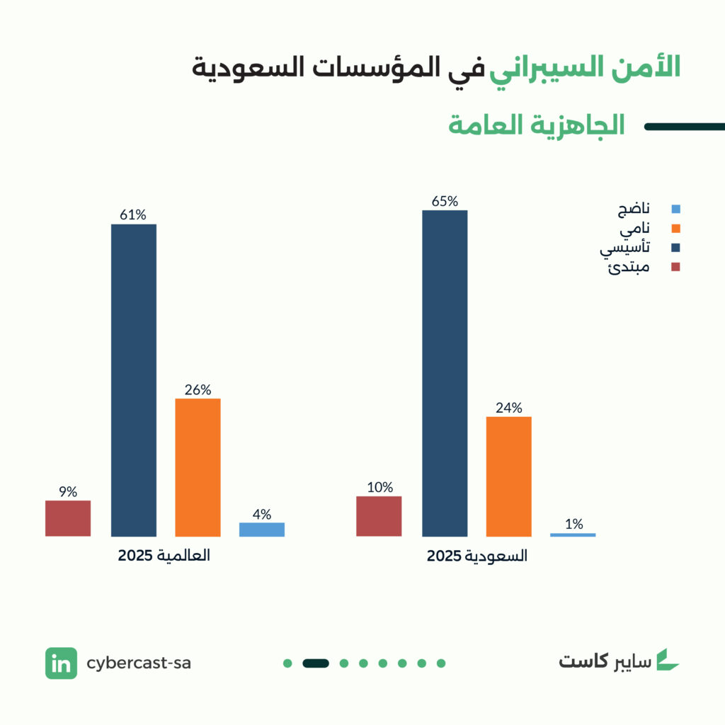 وسجلت السعودية تقدماً ملموساً، إذ ارتفعت نسبة المؤسسات ذات الجاهزية الناضجة إلى 8%، بينما انخفضت الفئات النامية من 23% إلى 21% والتأسيسية من 56% إلى 50% ، في حين ارتفعت النسبة من 17% إلى 21% لفئة الجاهزية المبتدئة. ما يشير إلى بدء مرحلة تحول تدريجي نحو التنفيذ الكامل للحلول الأمنية المتقدمة.