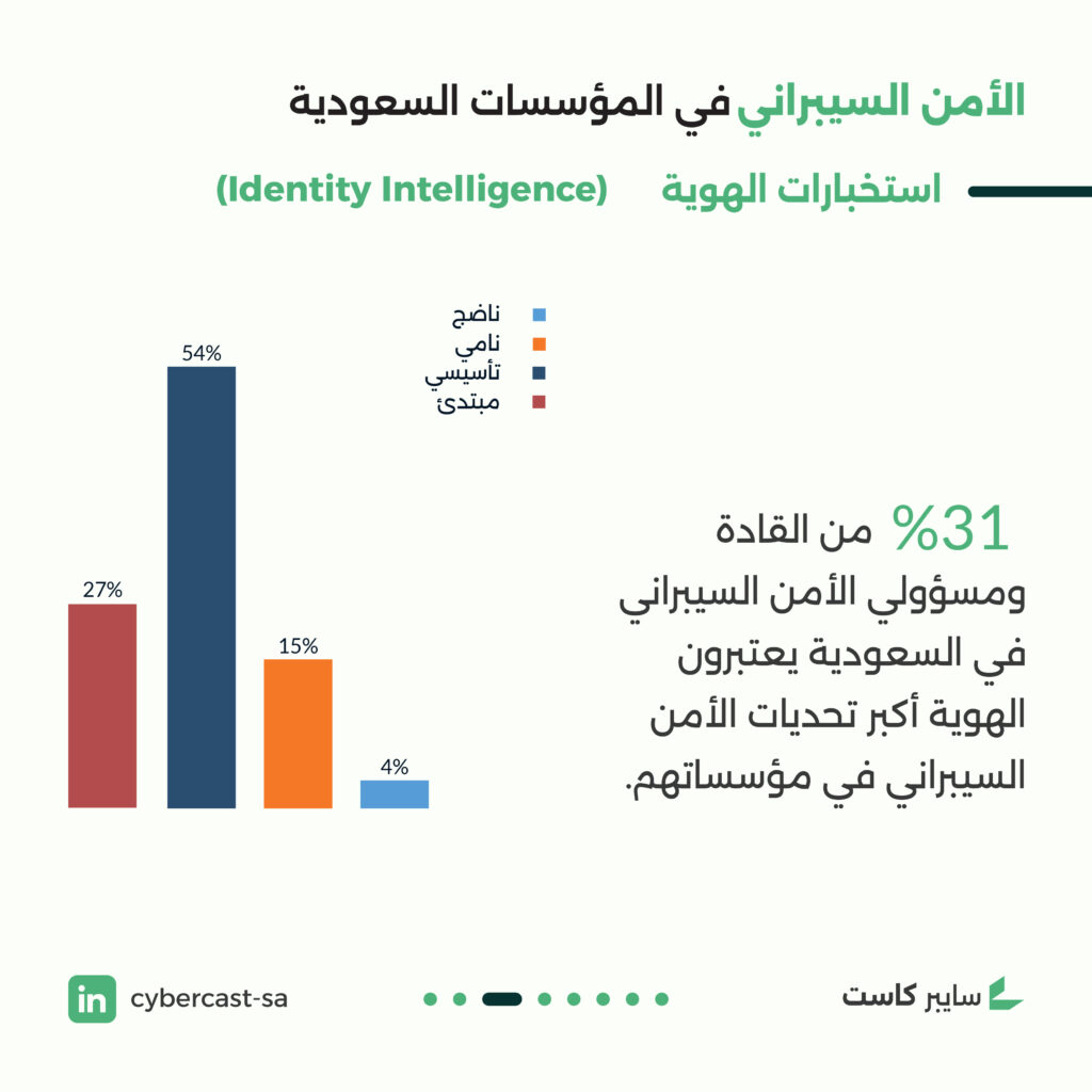 وتتبنى 44% من المؤسسات السعودية حلولاً تعتمد على الذكاء الاصطناعي في استخبارات الهوية، أبرزها تحليل سلوك الهوية ومراقبة الوصول المستمر للكشف عن الاختراقات.