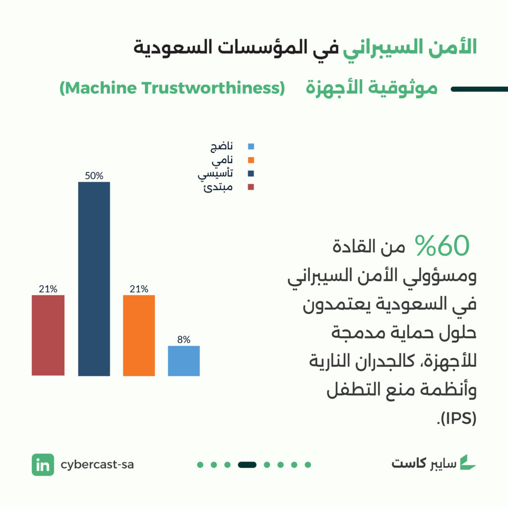صنفت ثلث المؤسسات السعودية هذا المحور ضمن أولوياتها الأمنية القصوى، وسجل تحسناً طفيفاً في المملكة مع انتقال عدد متزايد من المؤسسات من المرحلة التأسيسية إلى المرحلة النامية. وارتفعت نسبة الاستعداد الناضج من 2% إلى 4%، بينما ارتفعت الجاهزية النامية من 13% إلى 15%، في حين انخفضت النسبة من 58% إلى 54% لفئة الجاهزية التأسيسية، واستقرت النسبة عند 27% لفئة الجاهزية المبتدئة.
