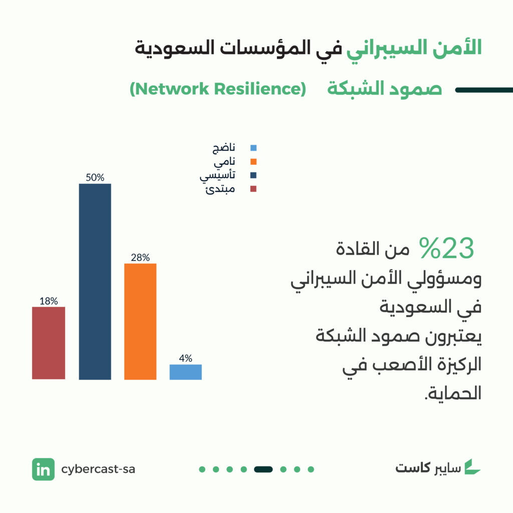 وصنف ما يقرب من ربع المؤسسات السعودية مرونة الشبكة على أنها الأكثر صعوبة في الحماية، وثاني أعلى مستوى بين جميع المحاور الأخرى.
