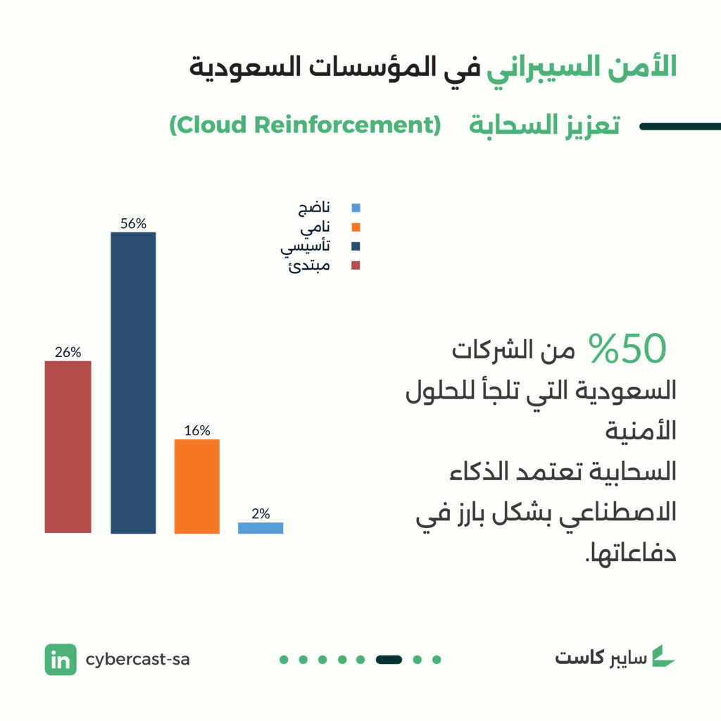 يركز هذا المحور على حماية البيئات السحابية من التهديدات، خصوصاً مع تزايد نقل البيانات والتطبيقات إلى السحابة. ورغم توسع الاستخدام في المملكة، لا تتجاوز نسبة الجاهزية الناضجة 2% فقط، بينما تقع أكثر من 80% من المؤسسات في المستويين الأدنى، أي مرحلة الجاهزية التأسيسية والمبتدئة.