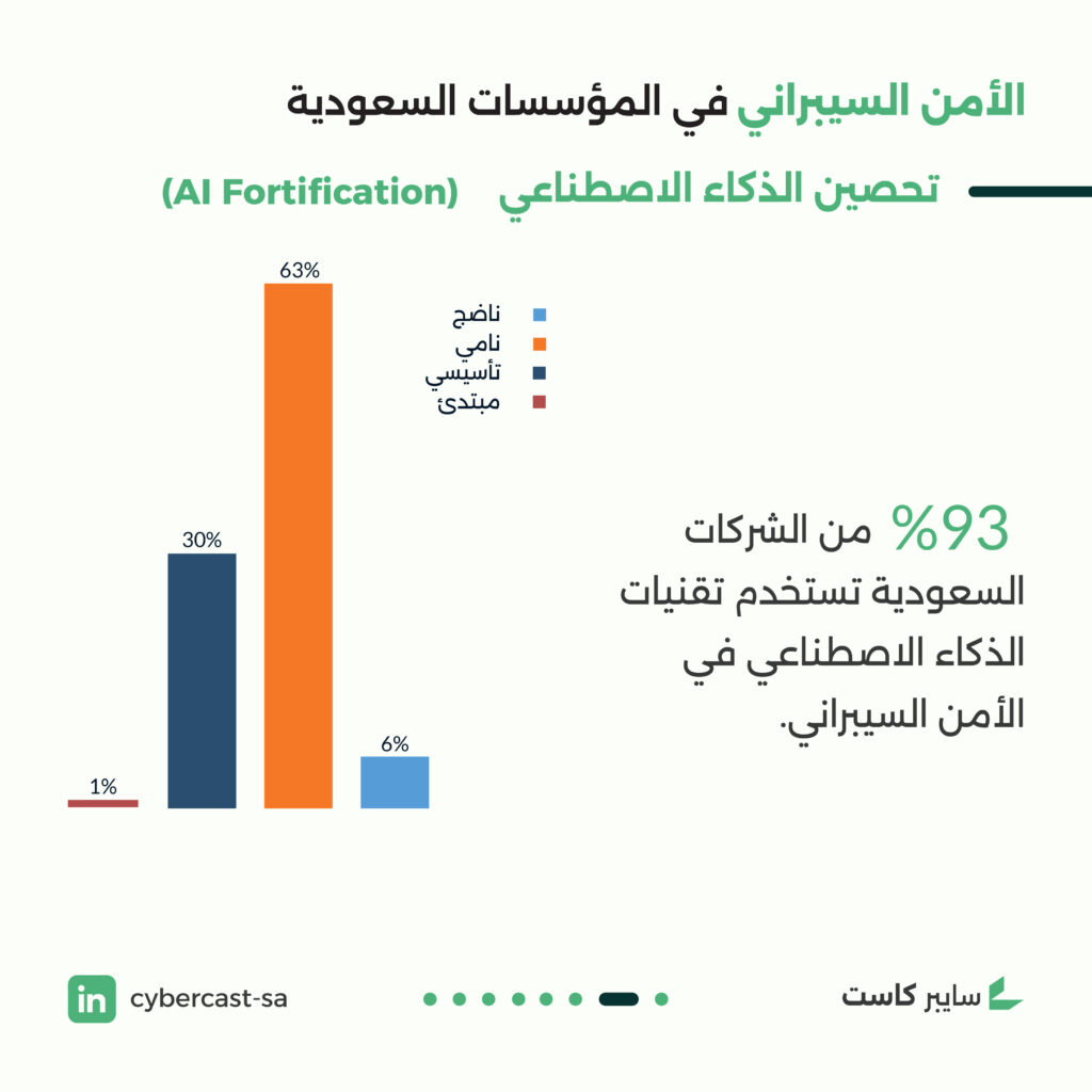 ووفقاً للتقرير، فقد لجأت نصف المؤسسات السعودية التي اعتمدت حلول حماية الشبكات إلى إدماج الذكاء الاصطناعي بشكل كبير في دفاعاتها الشبكية، ويشمل ذلك حلول الشبكات المعرفة برمجياً وأنظمة مراقبة الأداء.